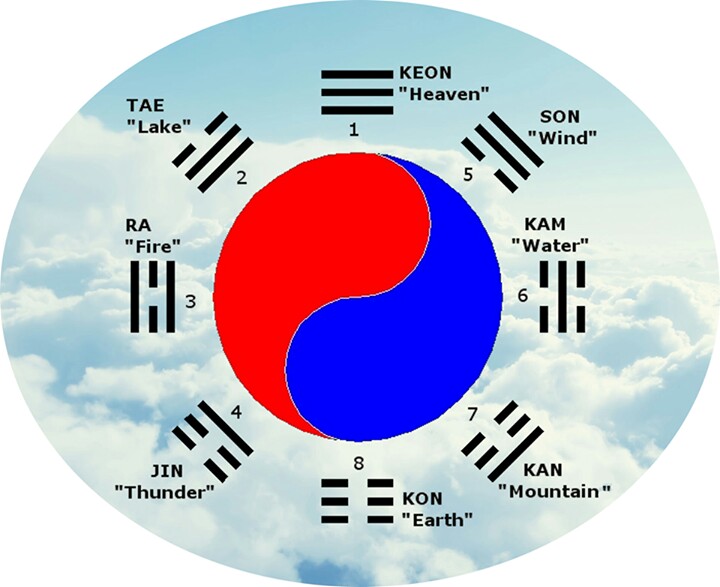 The word "Taeguek" comprises two Chinese characters: Tae meaning joyfulness, and Guek meaning eternity. Taeguek is the philosophical idea from which our views on life and the universe are derived. It has no form, no beginning, and no ending. Nevertheless, everything is embodied in, and has for its origin, Taeguek. From the Taeguek are derived eight major philosophical concepts, each of which is represented by its respective Chinese character. Accordingly, movement lines along these patterns are traditionally represented by these eight symbols, or Palgue. These Palgwe are arranged in a circle with each across from its complimentary opposite. The pairs are: Keon/Gon, Tae/Gan, Ri/Gam, and Jin/Seon. The Taeguek and Palgwe patterns 1 through 8 are based upon these eight principles.